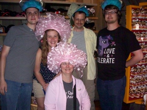 My niece (who had never been to the park before) asked to stop in at a gift shop to purchase a Minnie Mouse tank top. As she was checking out, we struck up a conversation with Gloria, the helpful cast member behind the counter. My niece commented on a tutu hat that someone outside was wearing and Gloria seized the opportunity to show us where the hats were stocked. She decked out Cathy and our niece with the tutu hats and got the boys and I to wear Sully hats while we all posed for a picture. It was one of those silly-but-fun moments that so endears the park to Cathy and I.